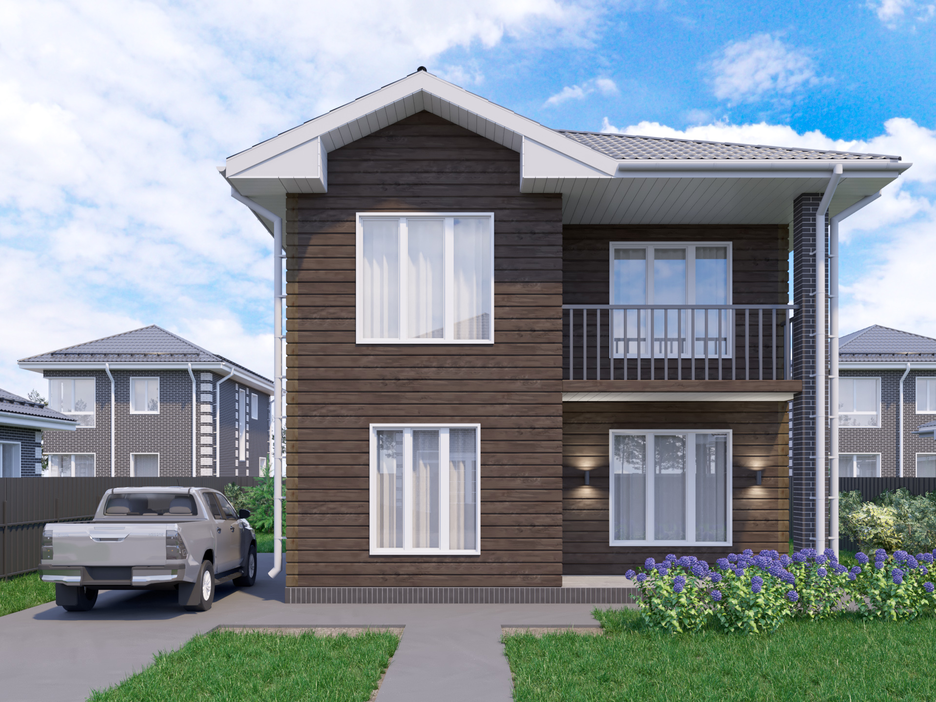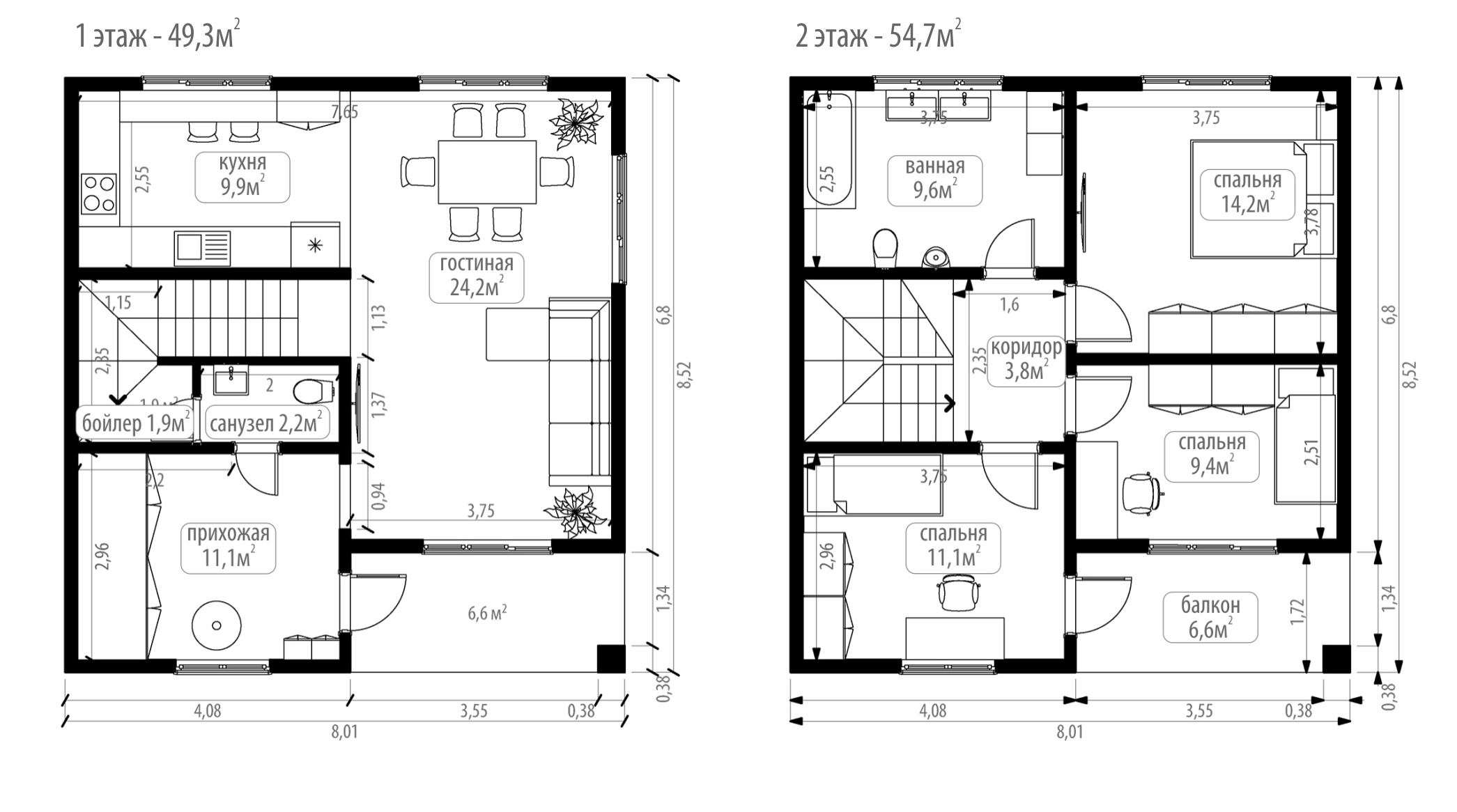 Двухэтажный дом площадью 104 м2. На первом этаже — прихожая с местом для хранения, из которой предусмотрен вход в санузел и бойлерную. Удобная кухня 9,9 м2 с выходом в просторную гостиную 24 м2. На втором этаже — три спальни с выходом в коридор, одна из которых с видовым балконом 6,6 м2. Также на втором этаже расположена большая ванная комната 9,6 м2.