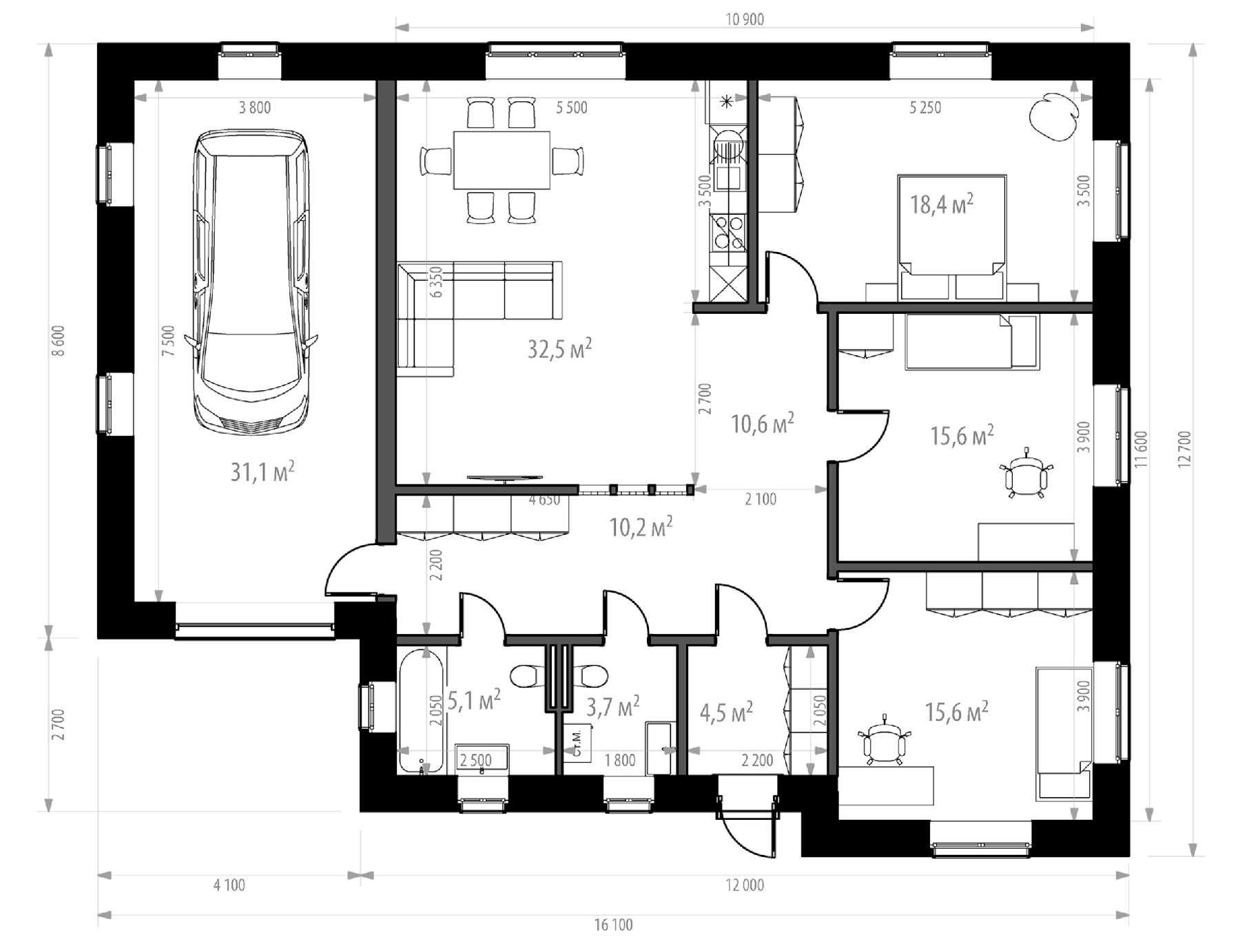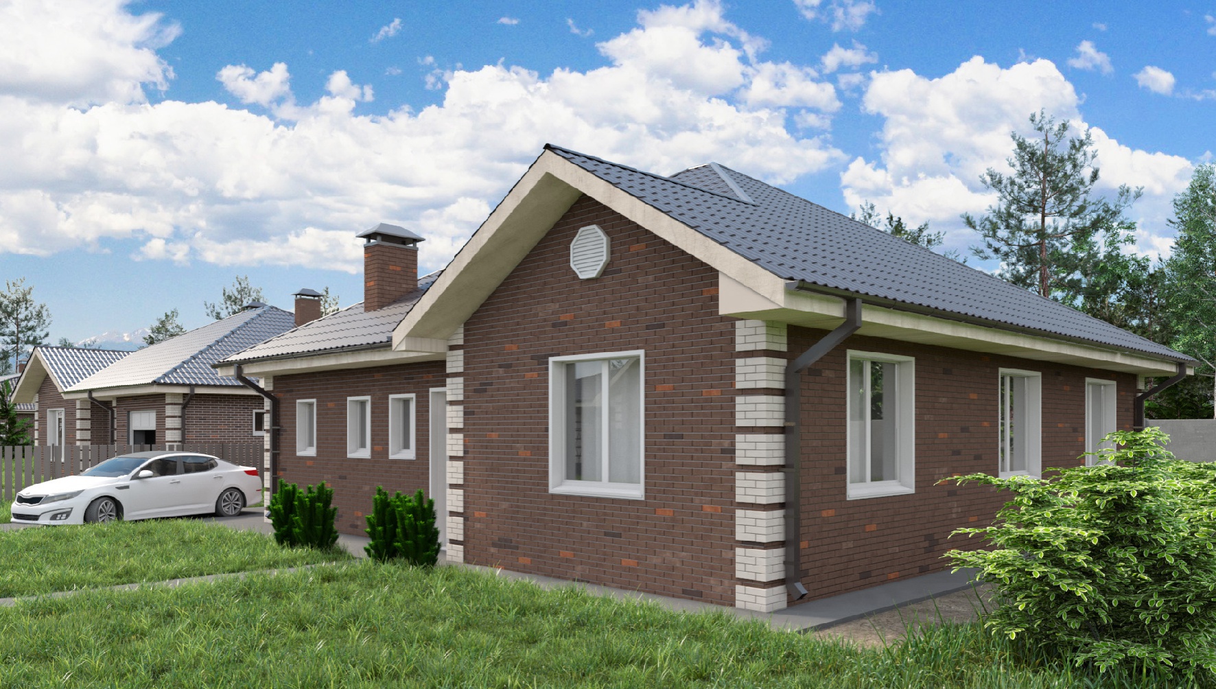 Одноэтажный дом площадью 147 кв. м.с просторной гостиной и тремя спальнями. Рядом с выходом из прихожей два санузла, а сразу за ними — выход в одноместный гараж 31 кв. м., где можно хранить не только автомобиль, но и инструменты, самокаты, велосипеды и много других полезных вещей.