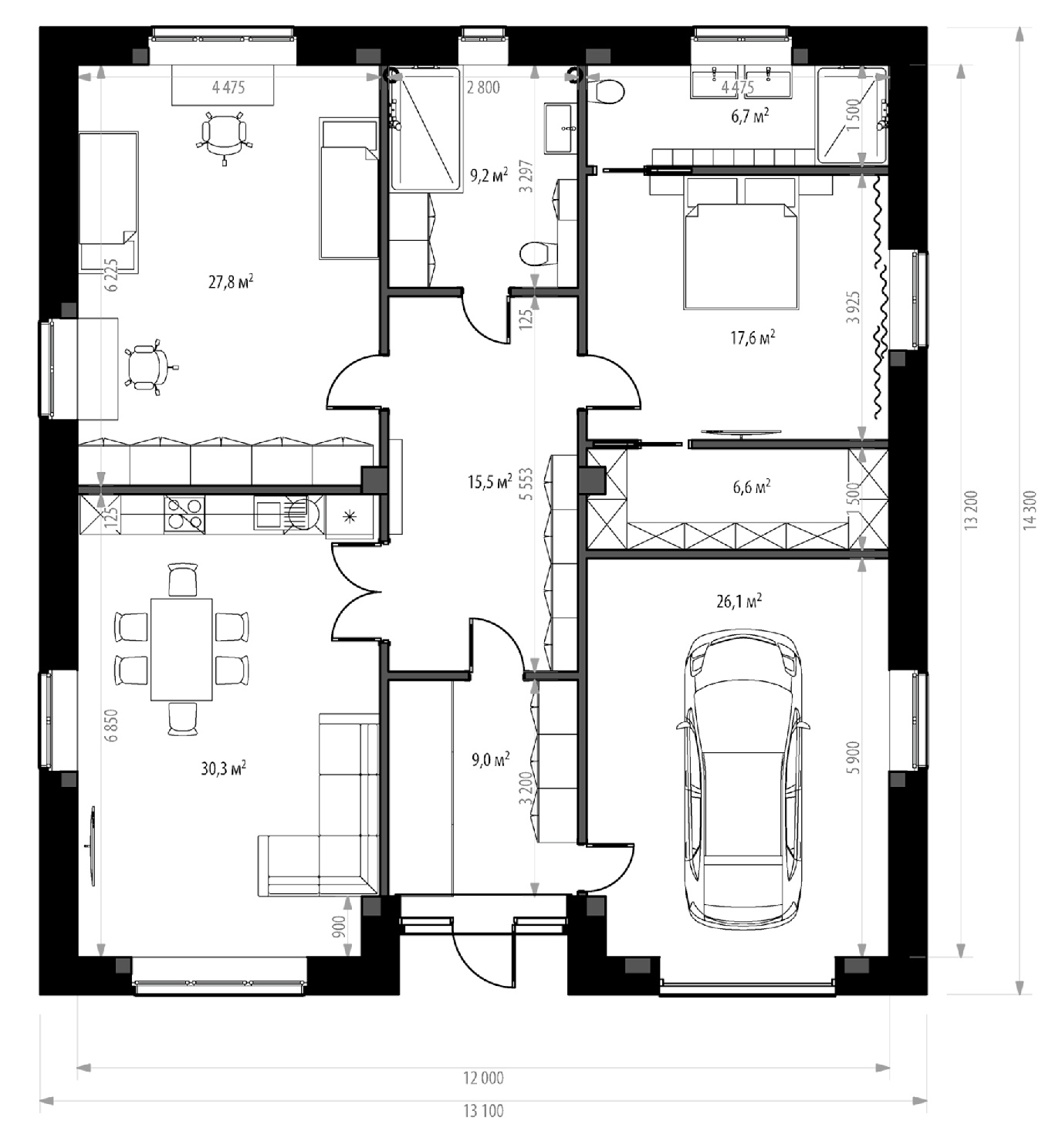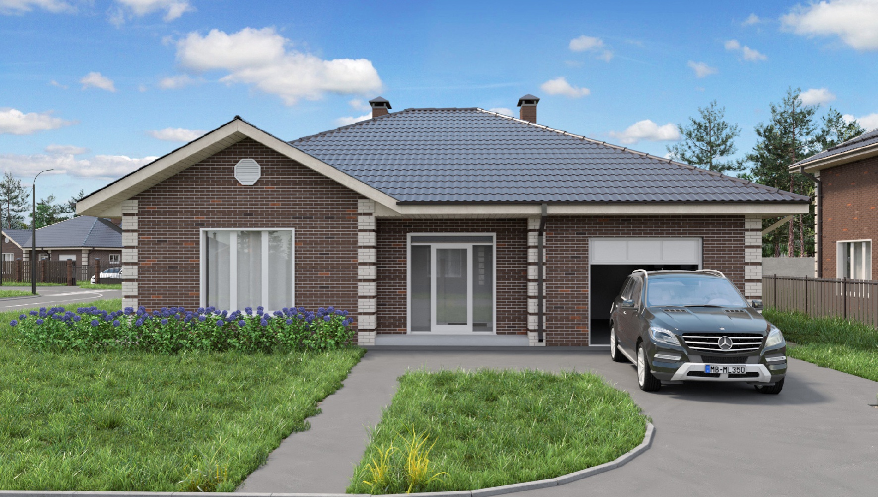 Одноэтажный дом площадью 149 кв. м. Идеальный по функциональности и расположению дом для небольшой семьи. Мастер-спальня с большими гардеробной и санузлом (по 6,6 кв. м.), детская, где можно свободно разместить две кровати, светлая гостиная с большими окнами. Из просторной прихожей есть выход в гараж для одной машины, с местом для инструментов или детского транспорта.