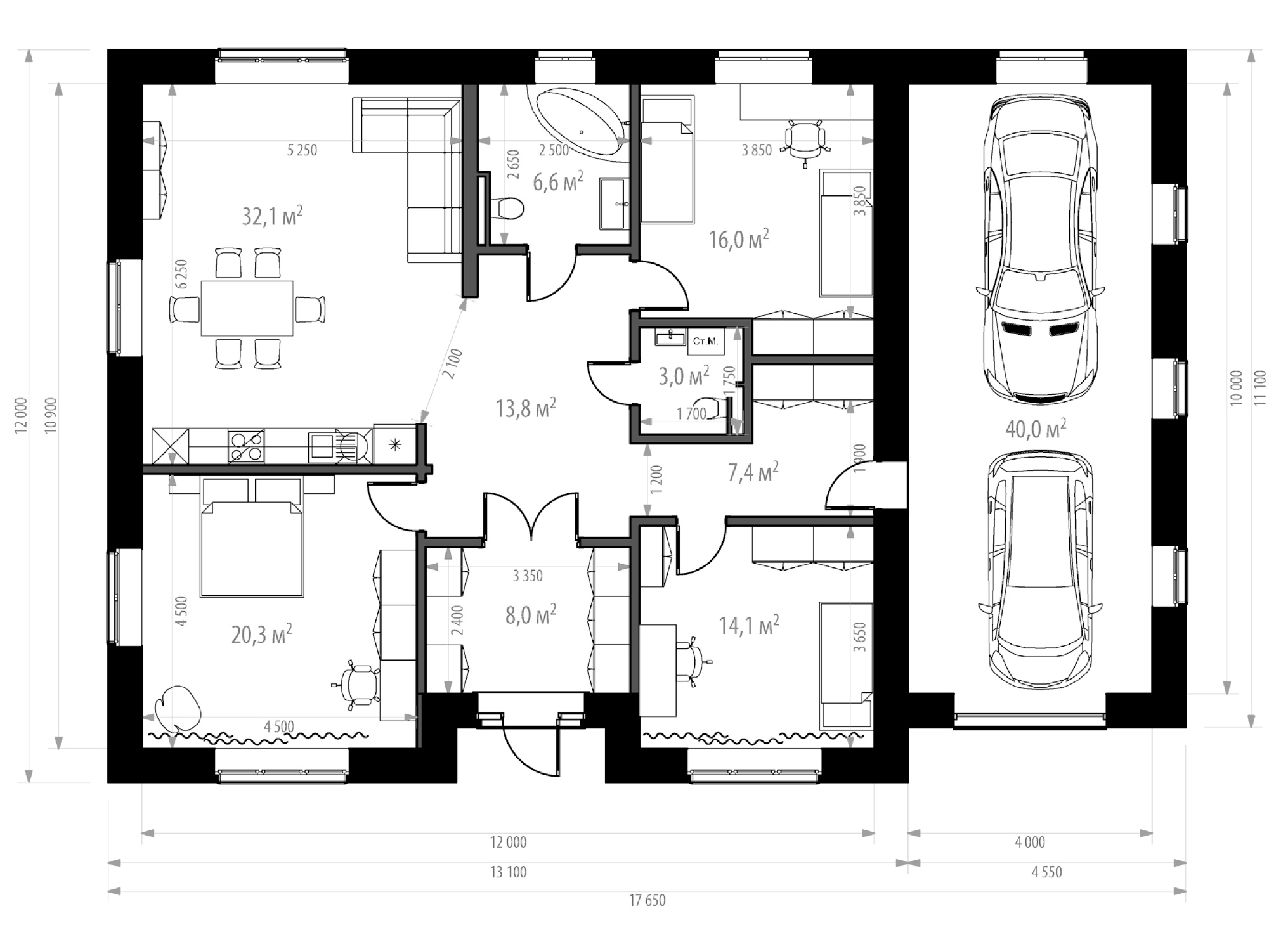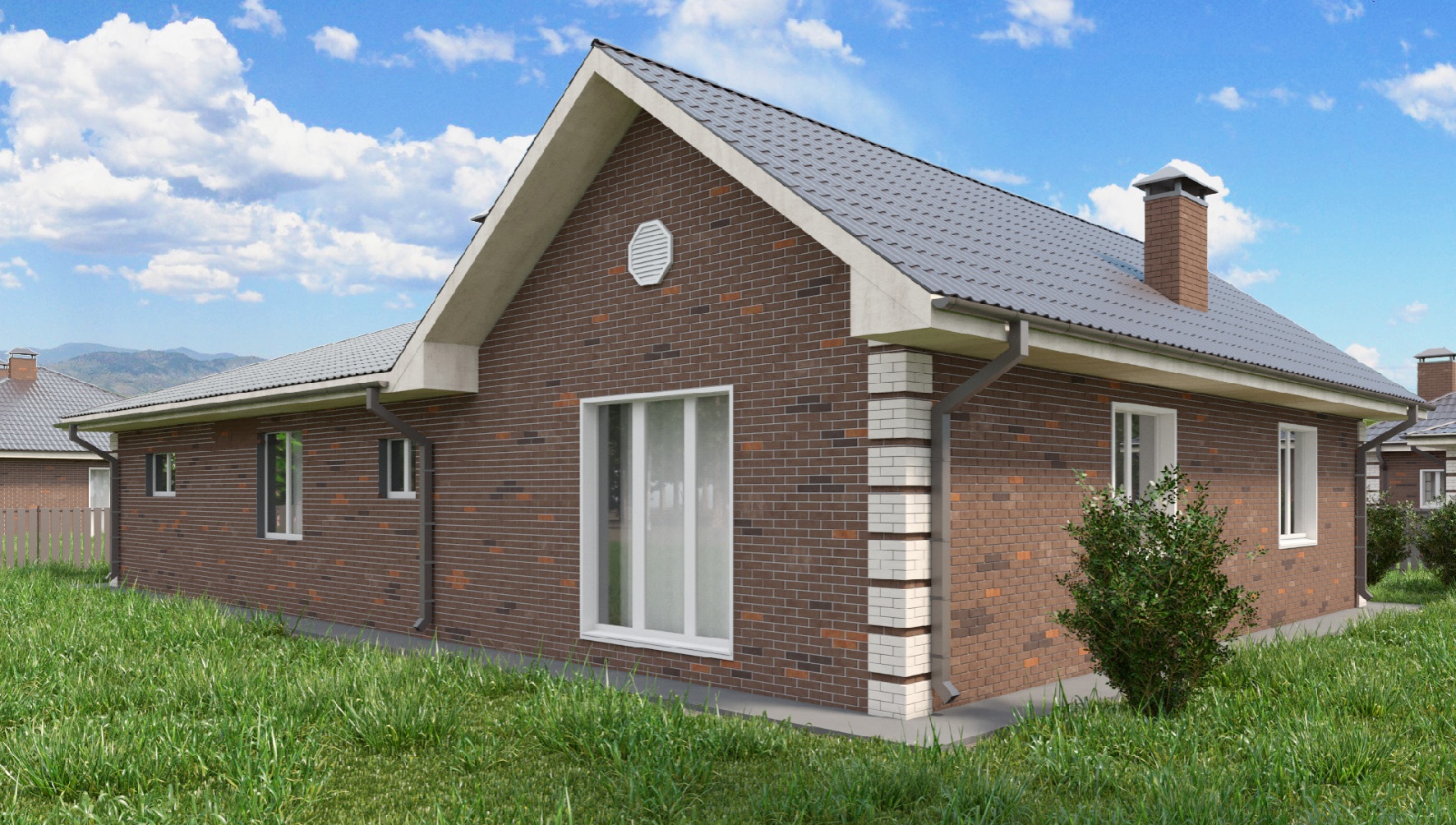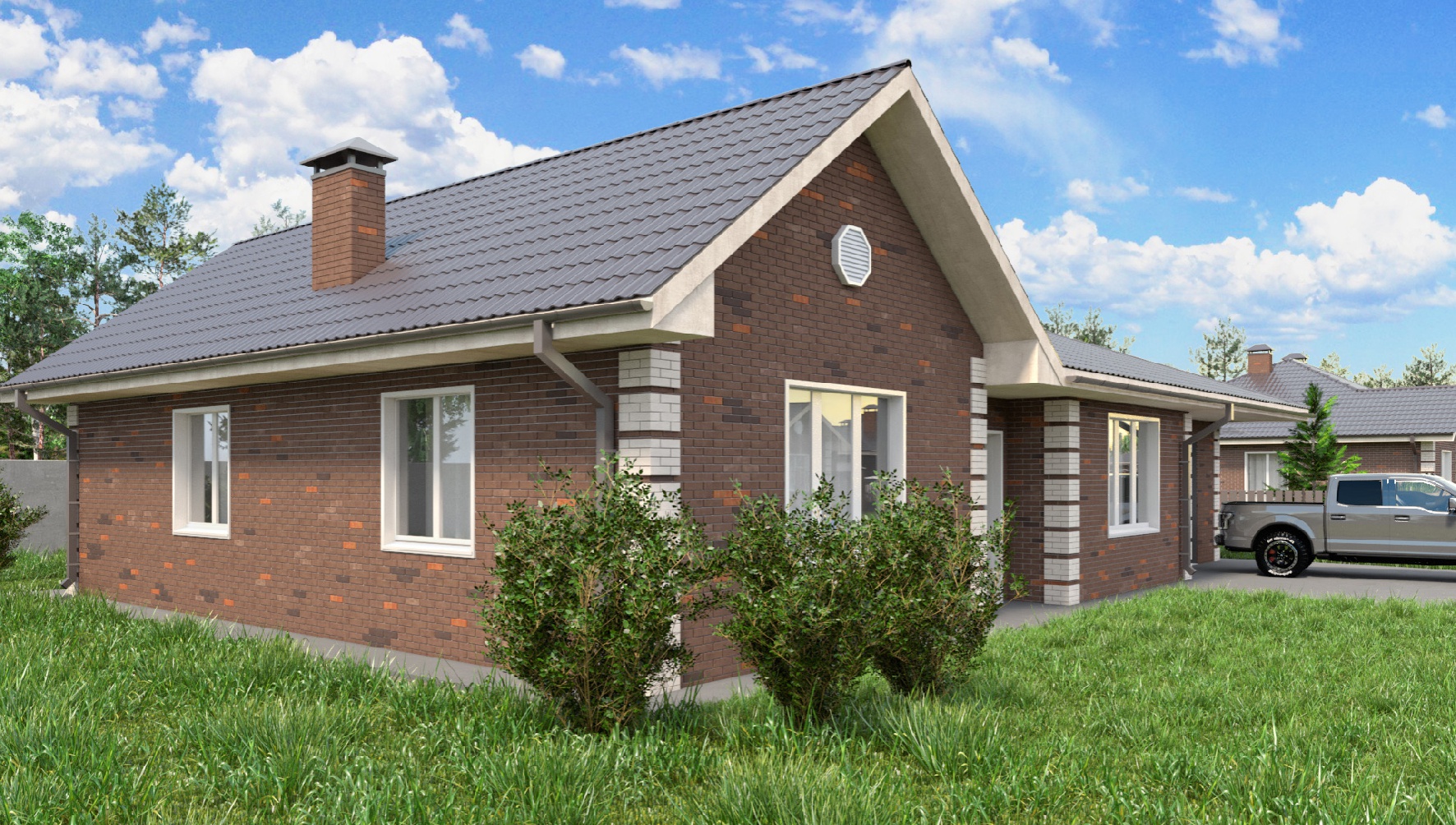 Одноэтажный дом площадью 161 кв. м., где есть все для комфортной жизни большого семейства с детьми. Три спальни, два санузла, все комнаты выходят в общий коридор. Просторный вход в гостиную с кухней. Встроенный гараж на две машины площадью 40 кв. м., выйти в него можно прямо из дома. В прихожей и коридоре предусмотрено место для полезной организации пространства, установки шкафов.
