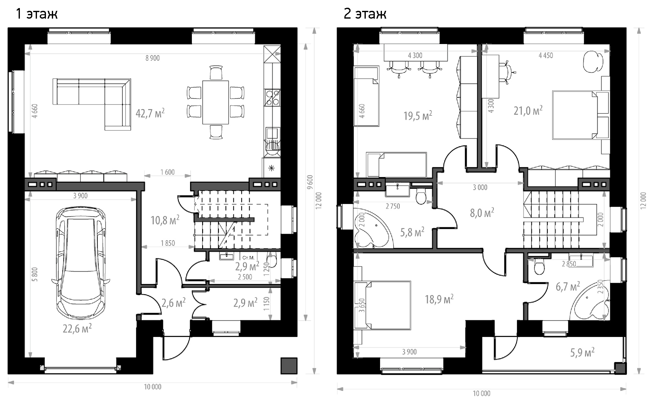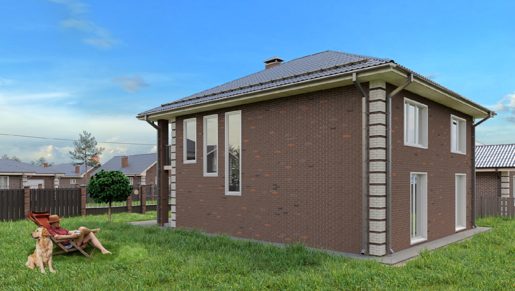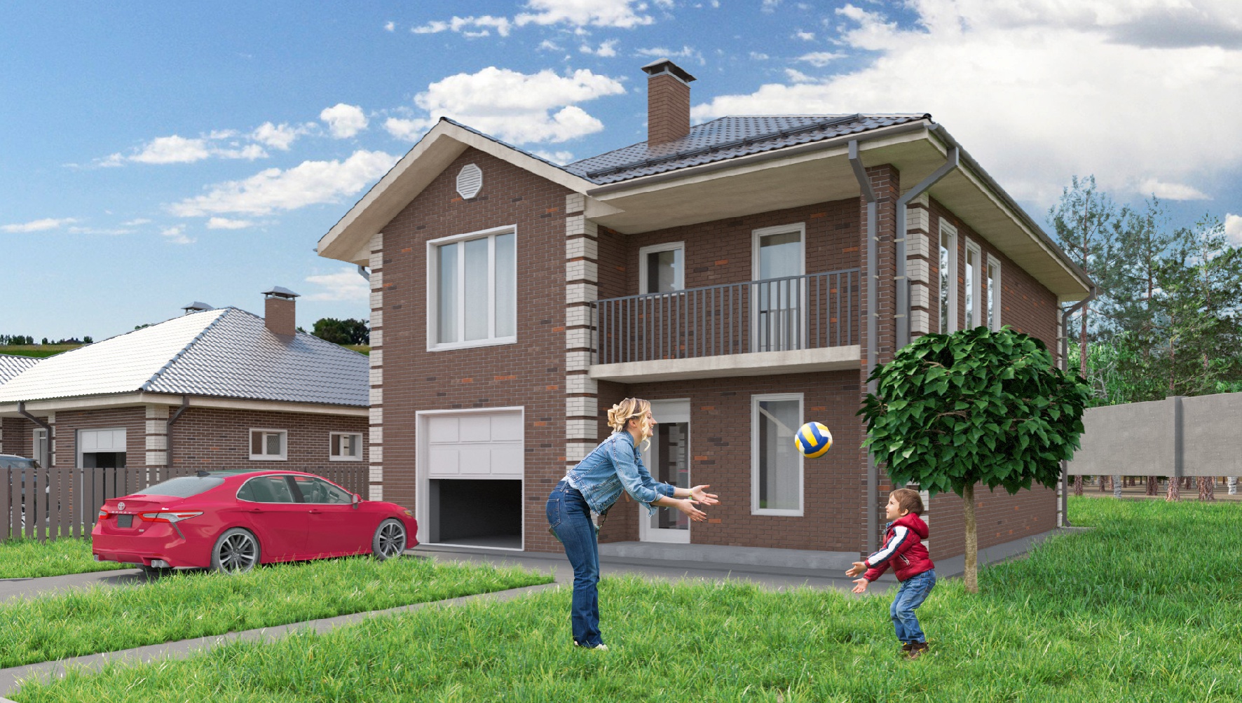 Двухэтажный дом площадью 170 кв. м. На первом этаже: большая прихожая с нишей для вещей под лестницей, гардеробная, просторная и светлая гостиная, выход во встроенный гараж на одну машину. На втором этаже: мастер-спальня с отдельным входом в ванную, две детские, лоджия и общий санузел. Здесь есть все для комфортной жизни — простор, функциональность, удобное расположение комнат.